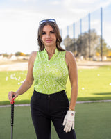 Channel retro charm with a fresh, modern twist in our Lime Sorbet golf polo. Set against a vibrant lime green backdrop, delicate white peace signs create a playful yet polished statement. Designed for women who effortlessly blend feminine flair with contemporary confidence, this polo moves seamlessly from the fairway to social gatherings. Celebrate individuality, enjoy all-day comfort, and express your unique style with the Lime Sorbet polo — where feel-good fashion meets performance.